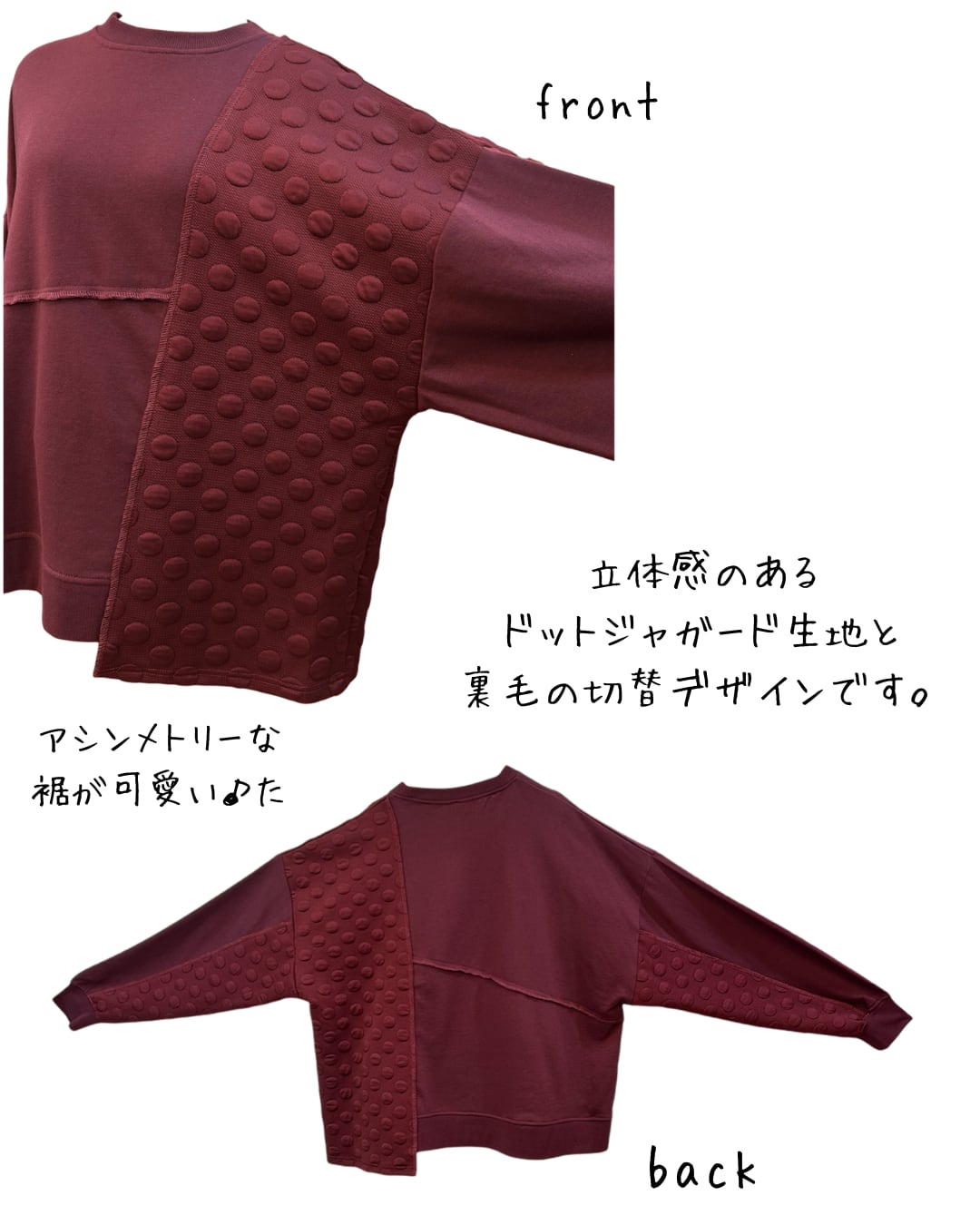 立体感のあるドット柄のジャガード生地と裏毛を切替えたプルオーバーです。