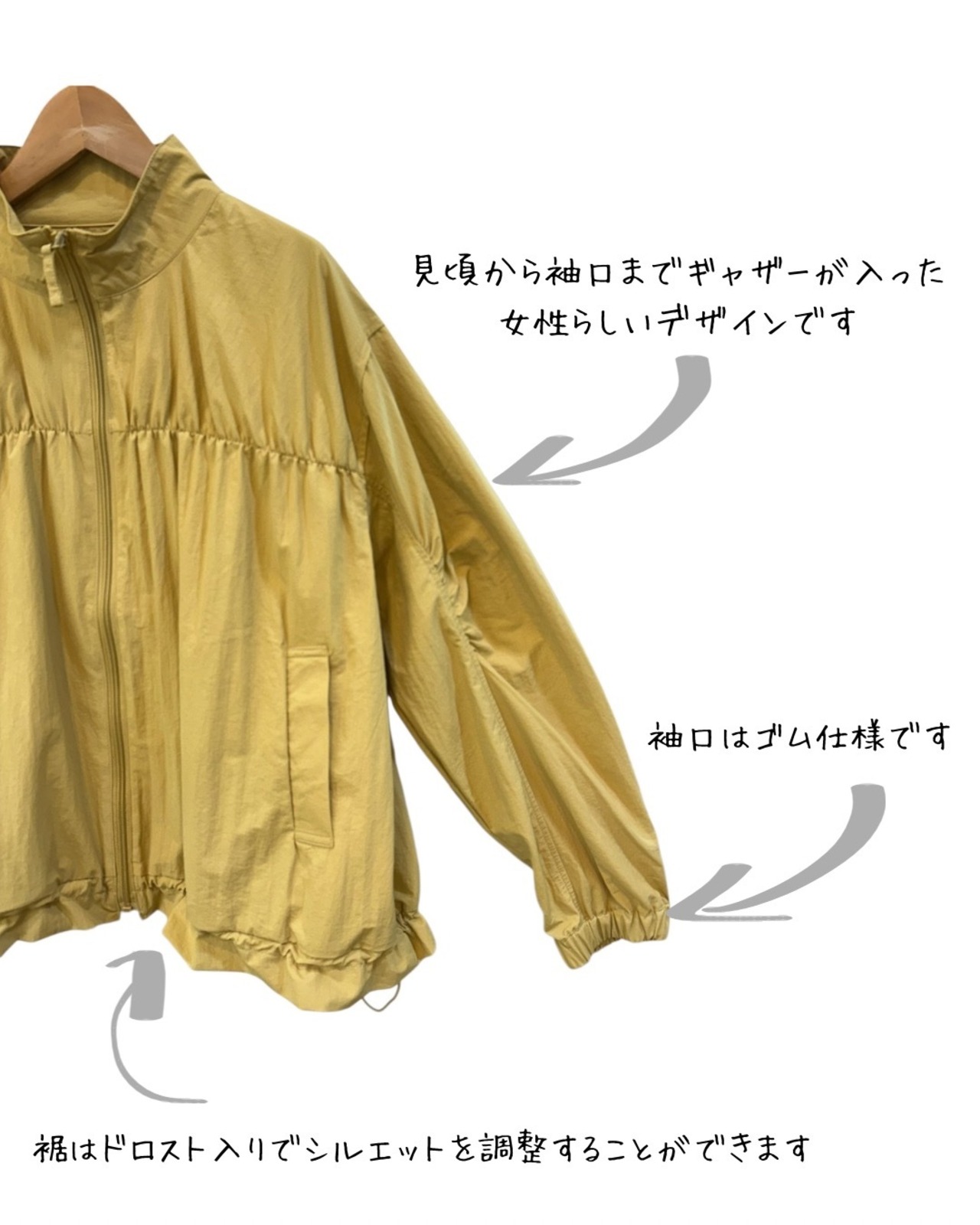 身頃から袖口にギャザーが入った女性らしいデザインのジャケットです。