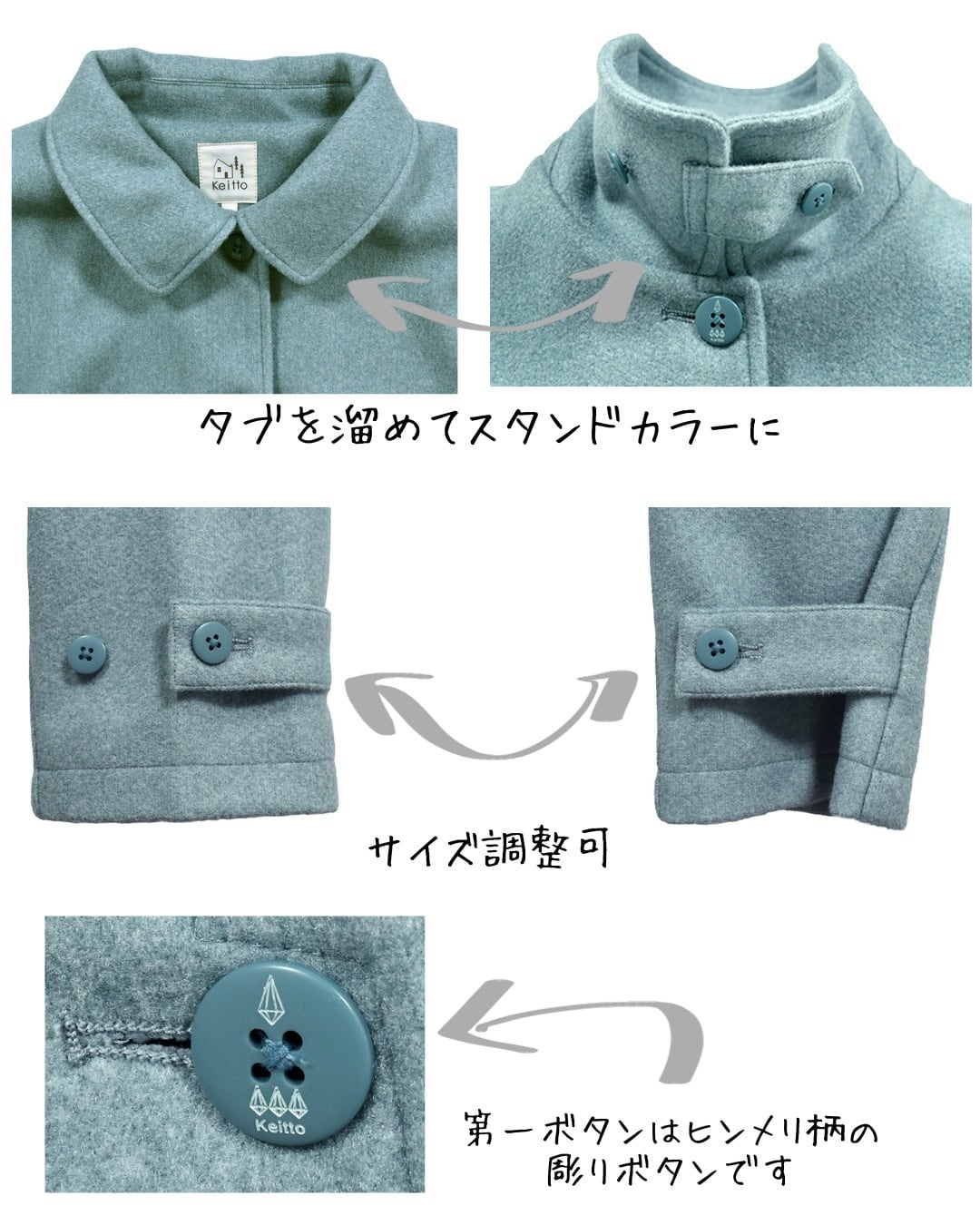 衿裏のタブを留めて首元を暖かく包み込むスタンドカラーとしても着用できる2wayネックデザインです。