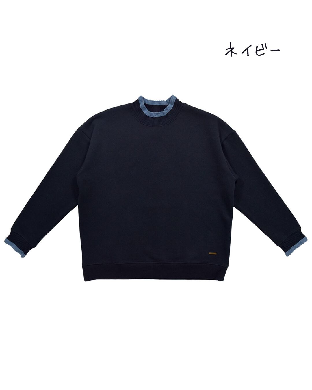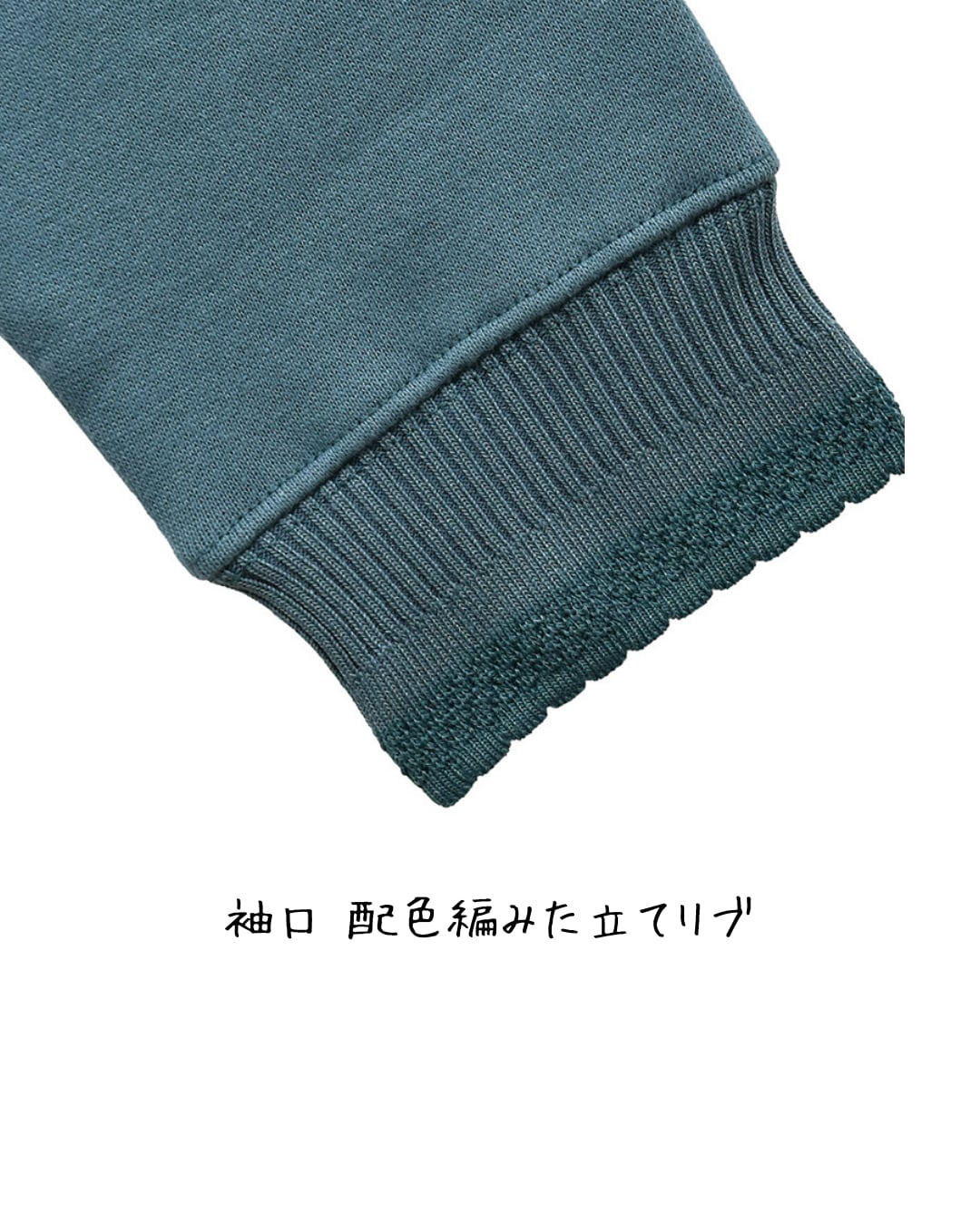 シンプルながらも襟ぐりと袖口の配色編み立てリブがアクセントになる1枚♪
