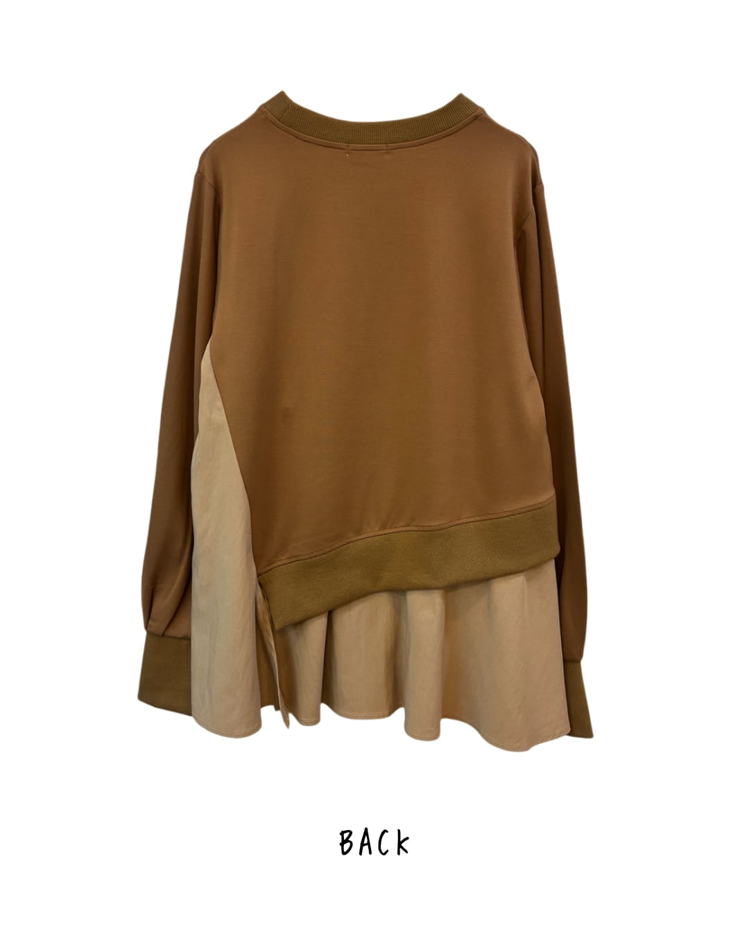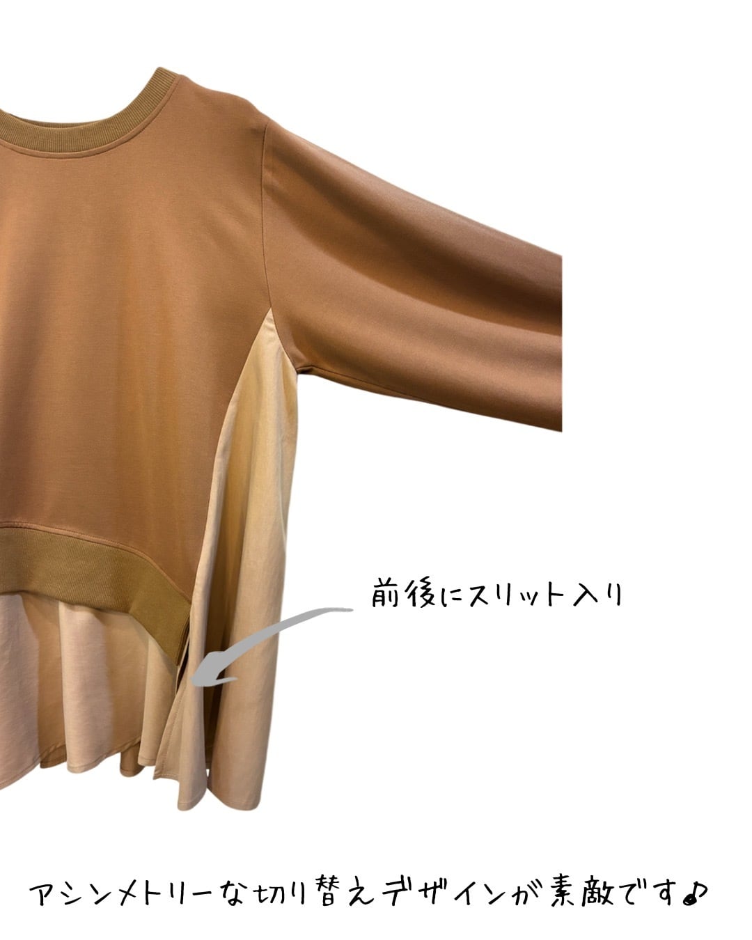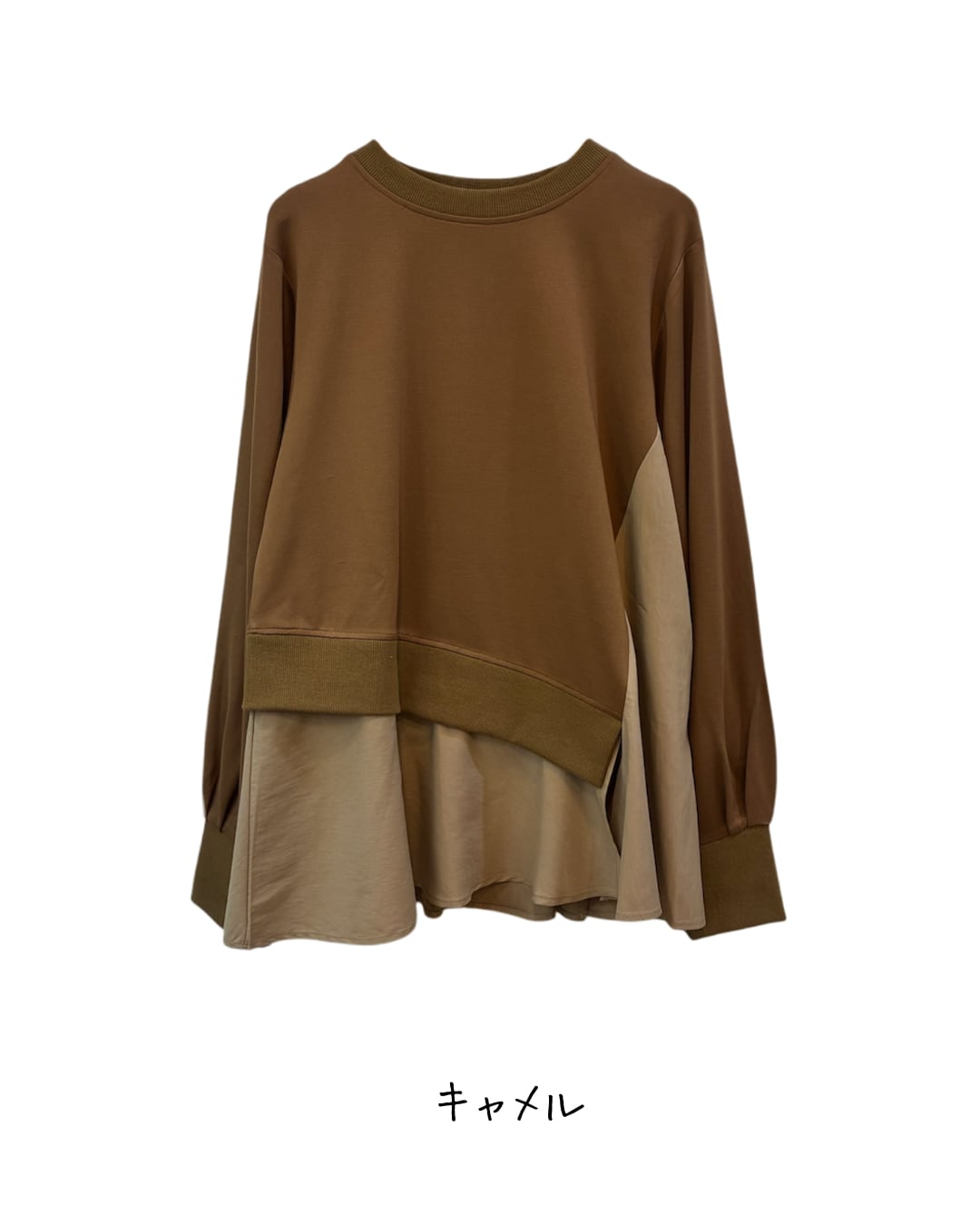 薄手ダンボールニットと布帛のレイヤードデザインが素敵なプルオーバーです。 アシンメトリーな斜めの切替えがスッキリと見せてくれます。