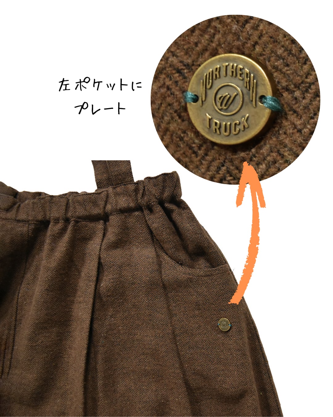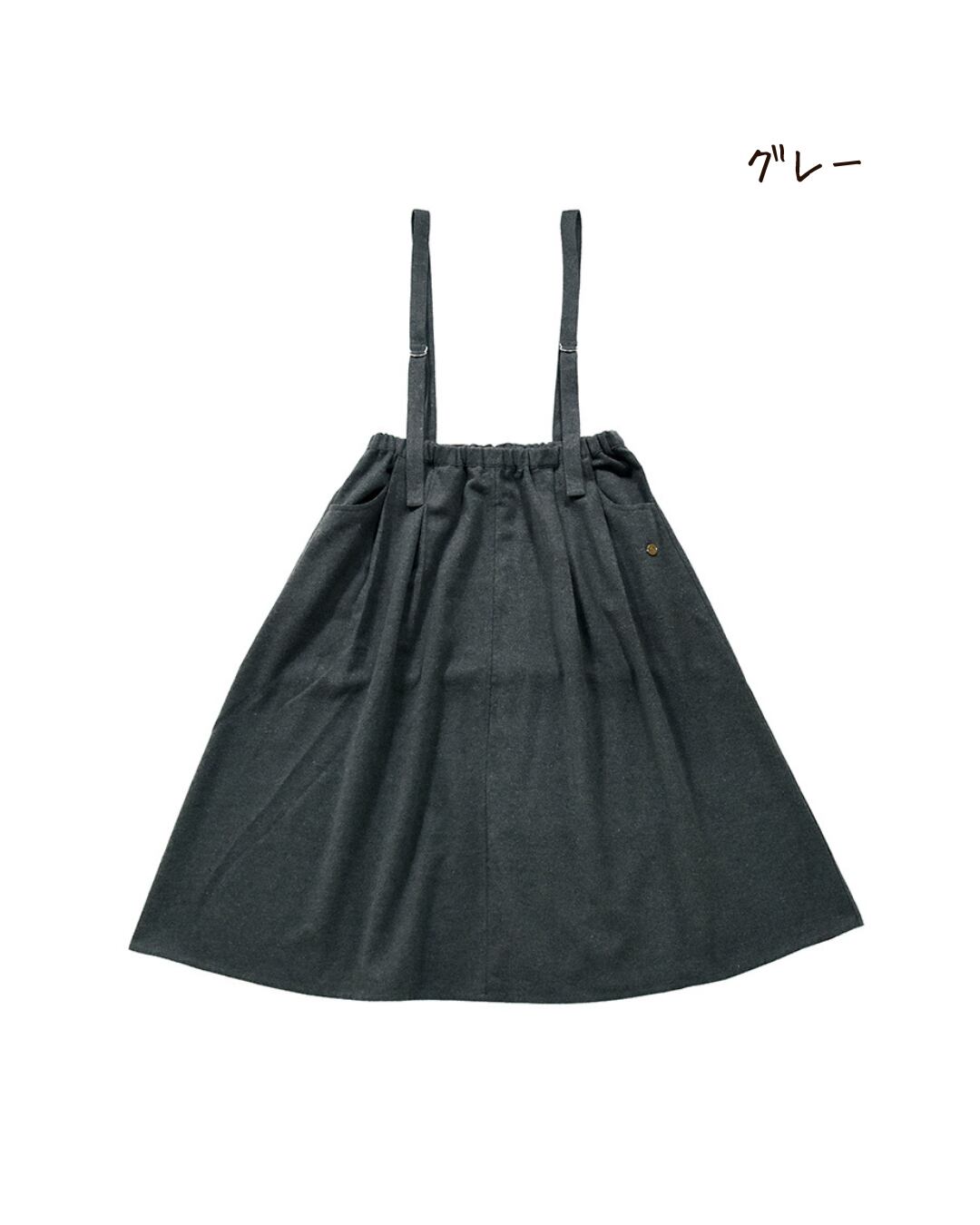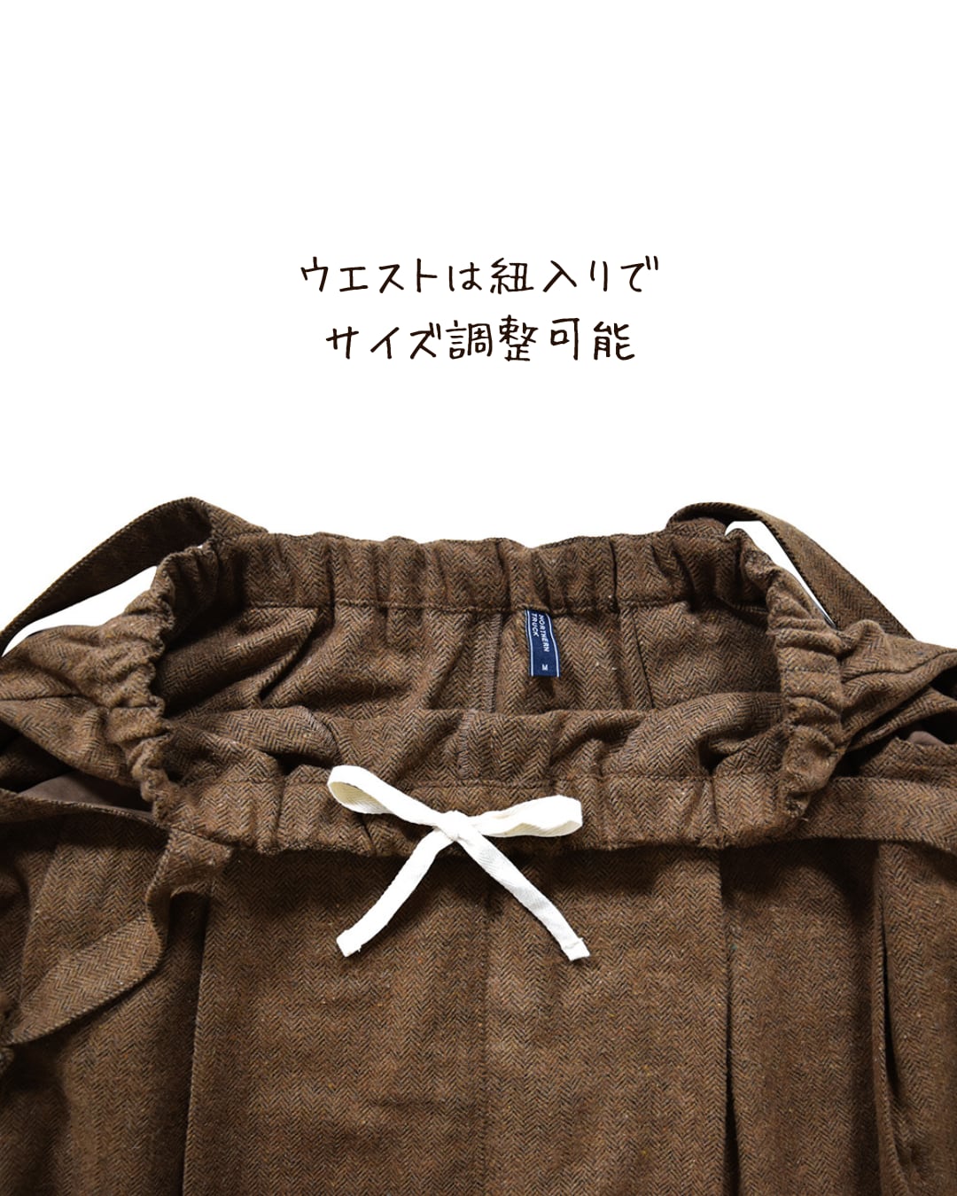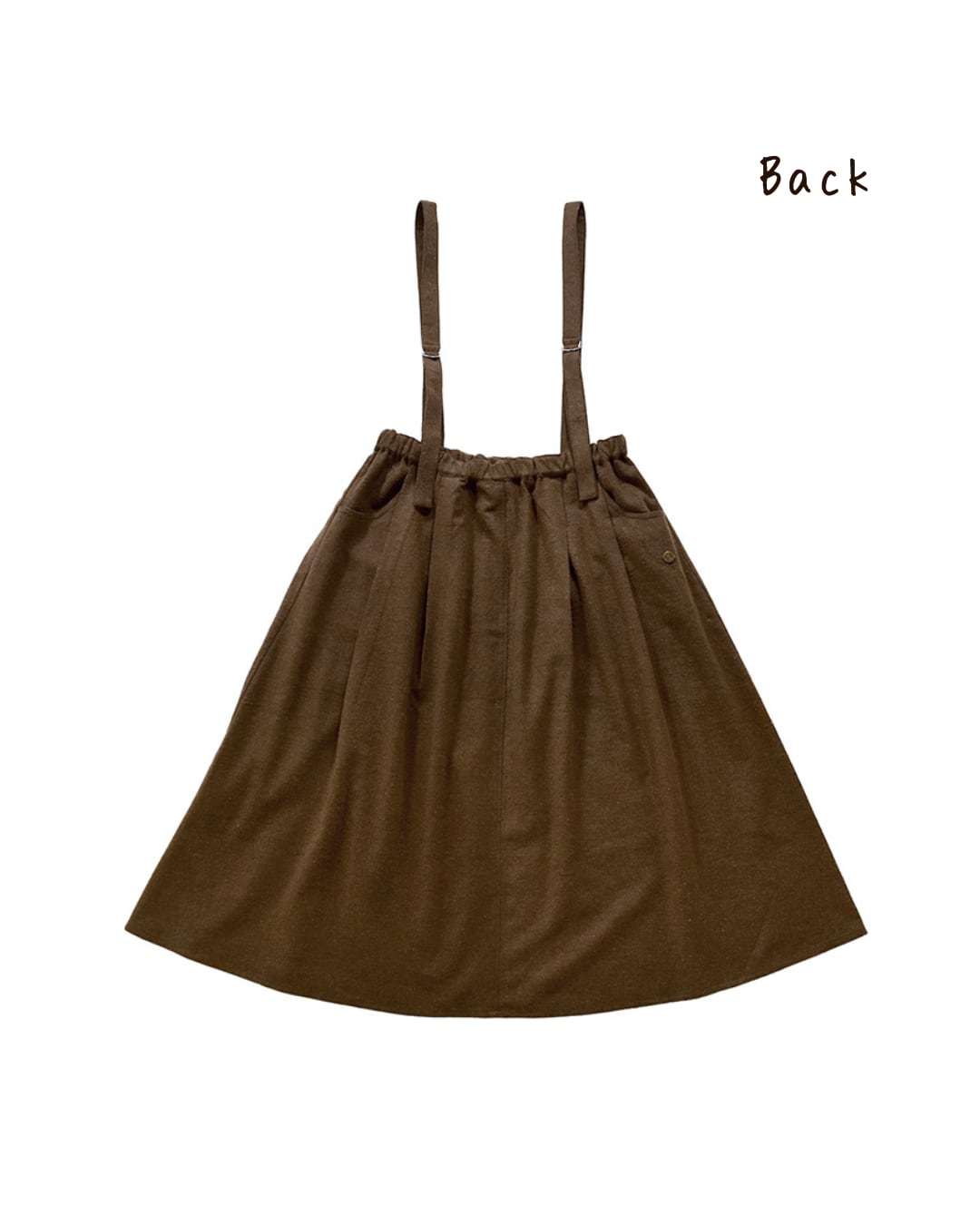 ヘリンボーンツイード素材を使用したサスペンダー付きロングスカート。