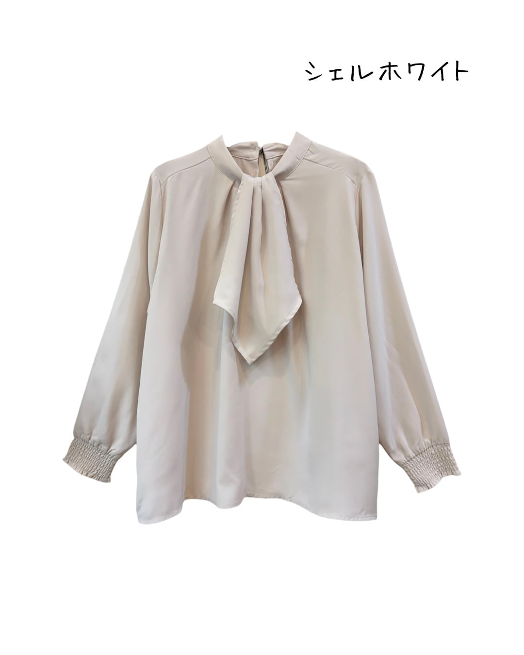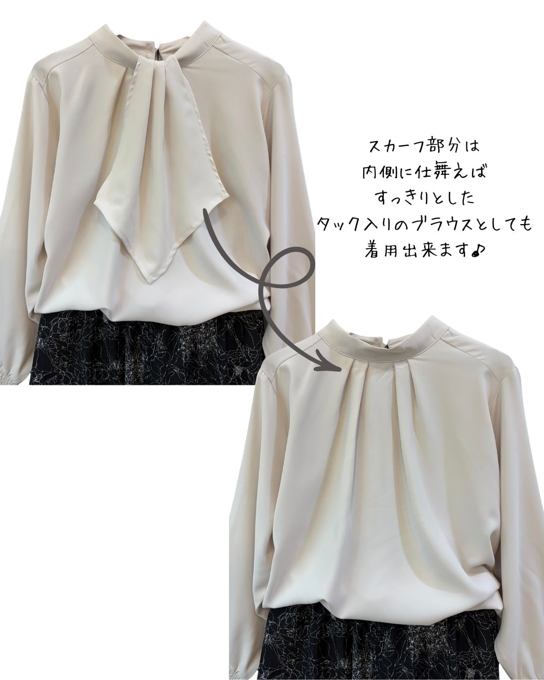 スカーフが華やかなプルオーバーブラウス。スカーフ部分は衿ぐりから内側に仕舞えますので、すっきりとしたハイネックタックブラウスとしても使えます。