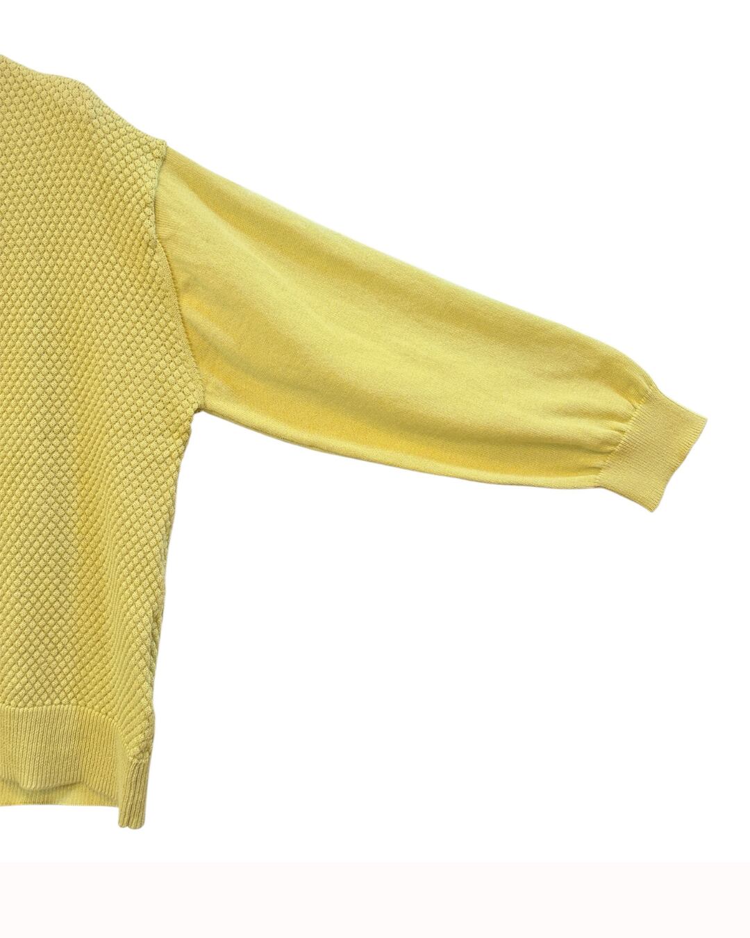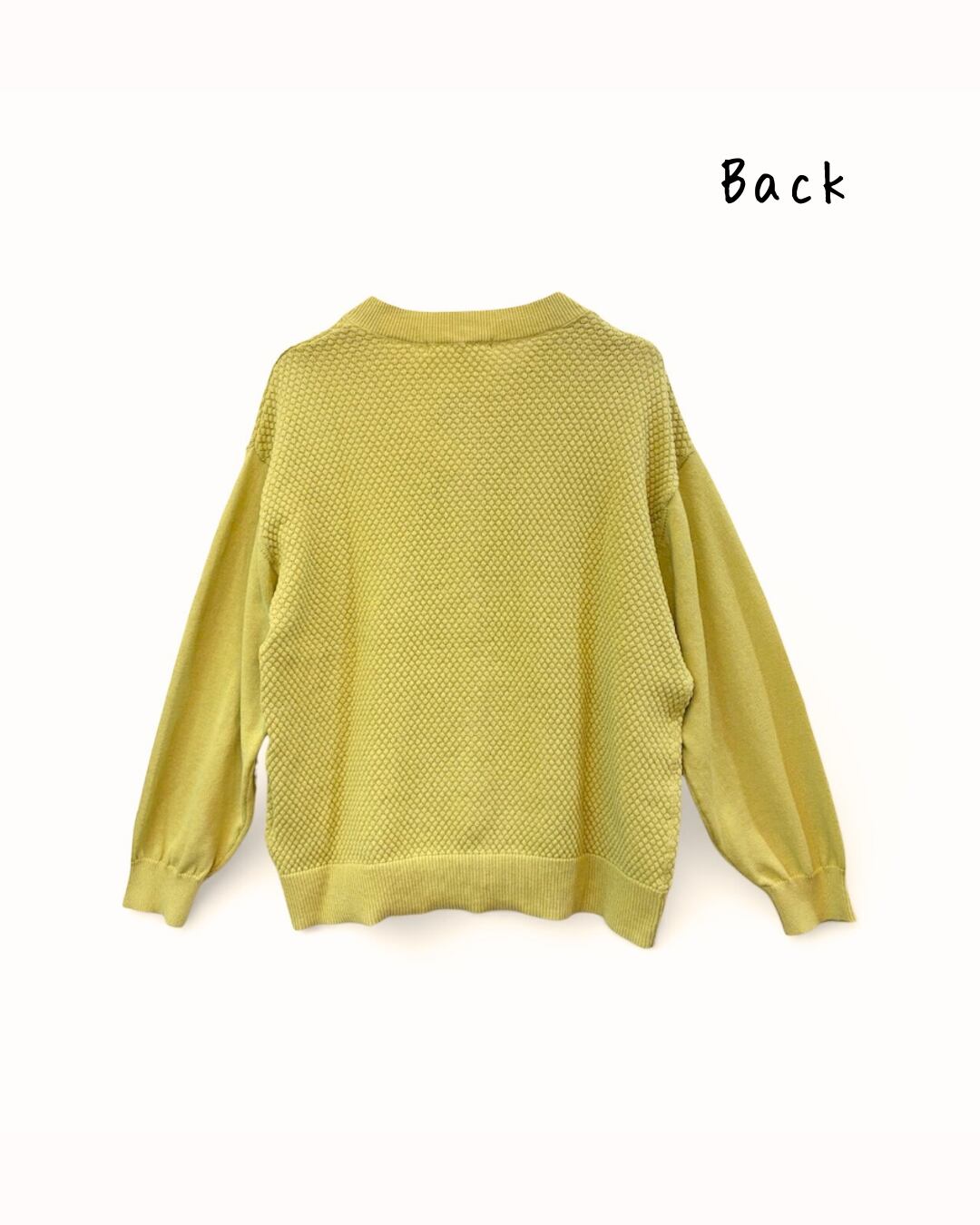 身頃には表面感のある編地、袖には天竺編みを使用しています。