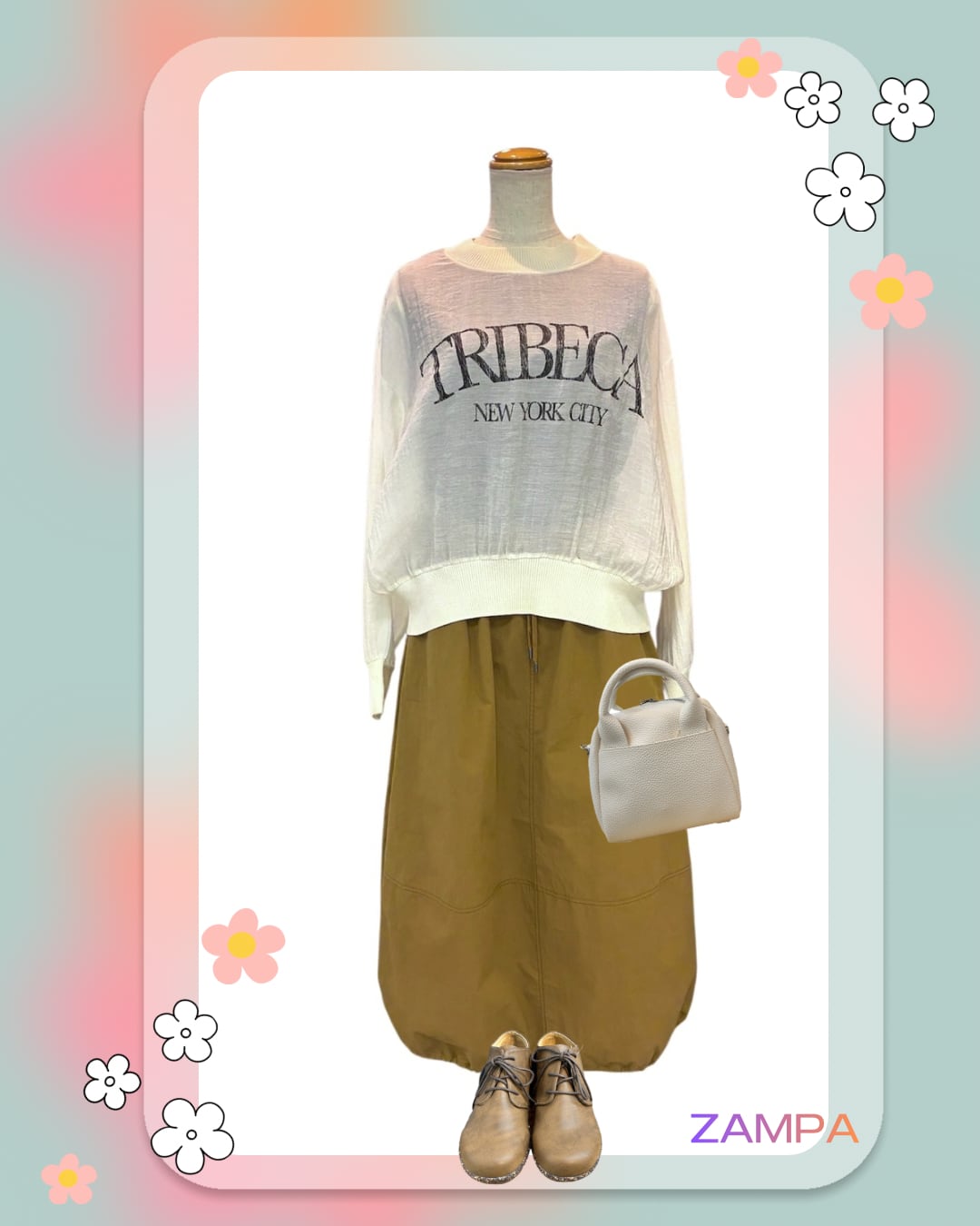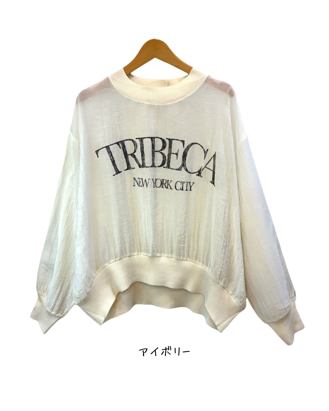 大きめのカレッジロゴに透け感のあるシアーローンを使って大人カジュアルな雰囲気になっています。