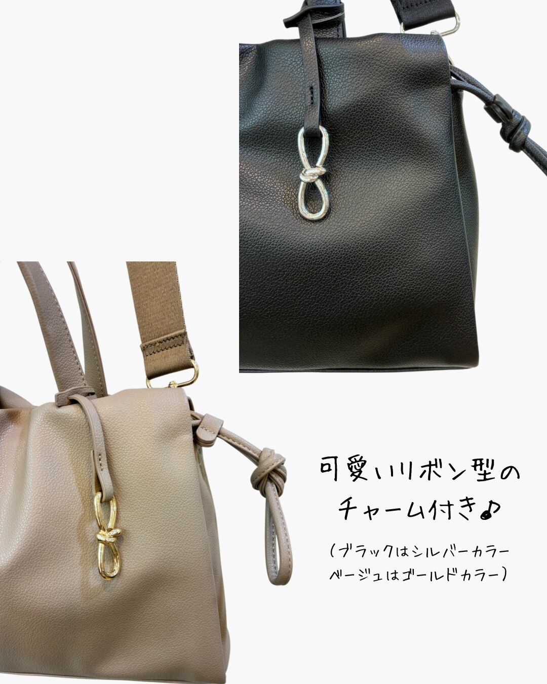 人気のワイドテープショルダーが付属した可愛いリボン型のチャーム付き2wayバッグです。