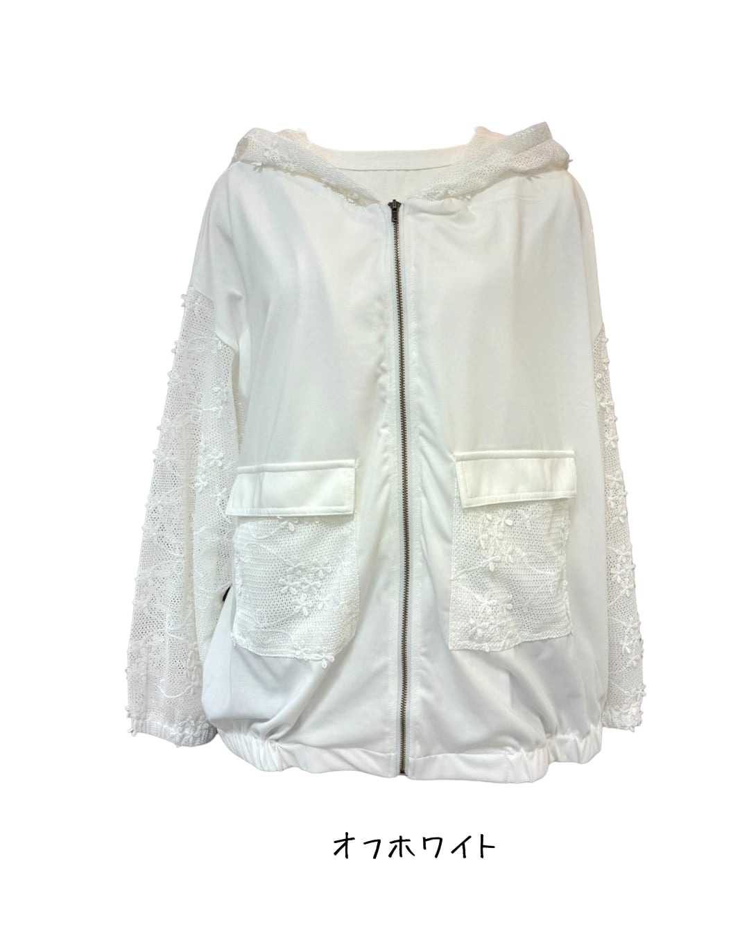 フード、袖、ポケットに綺麗な立体の花を使ったメッシュレースを使用しています。